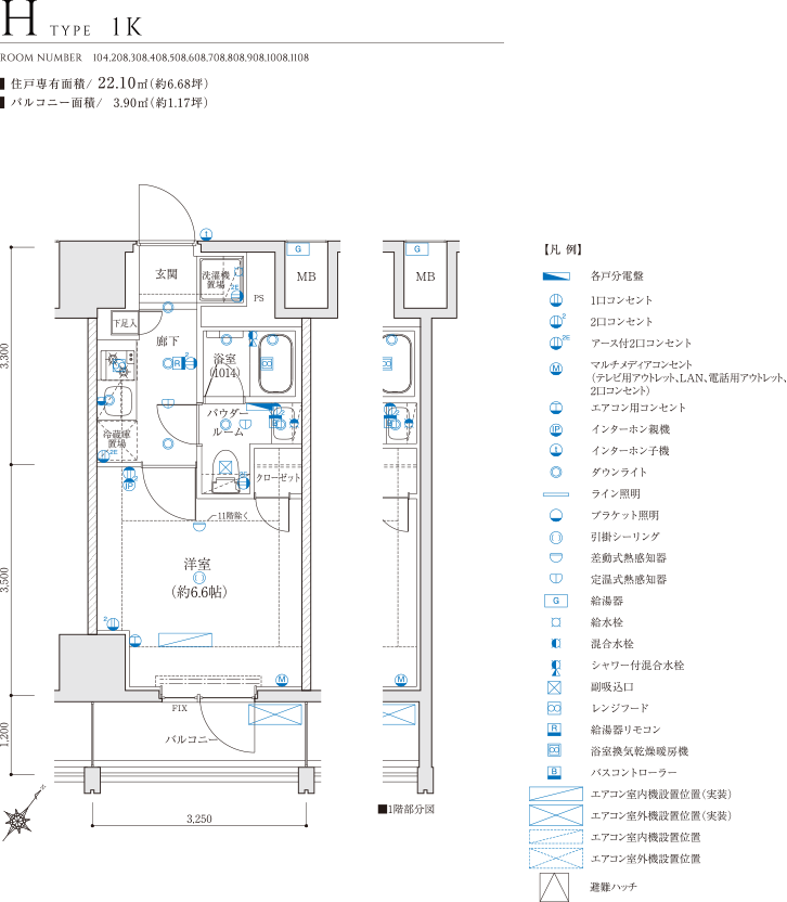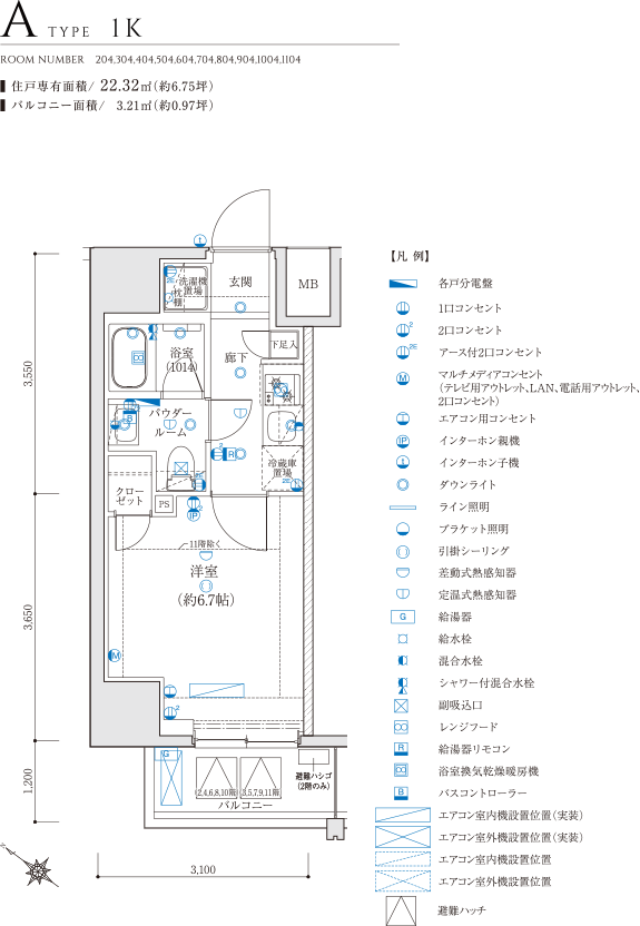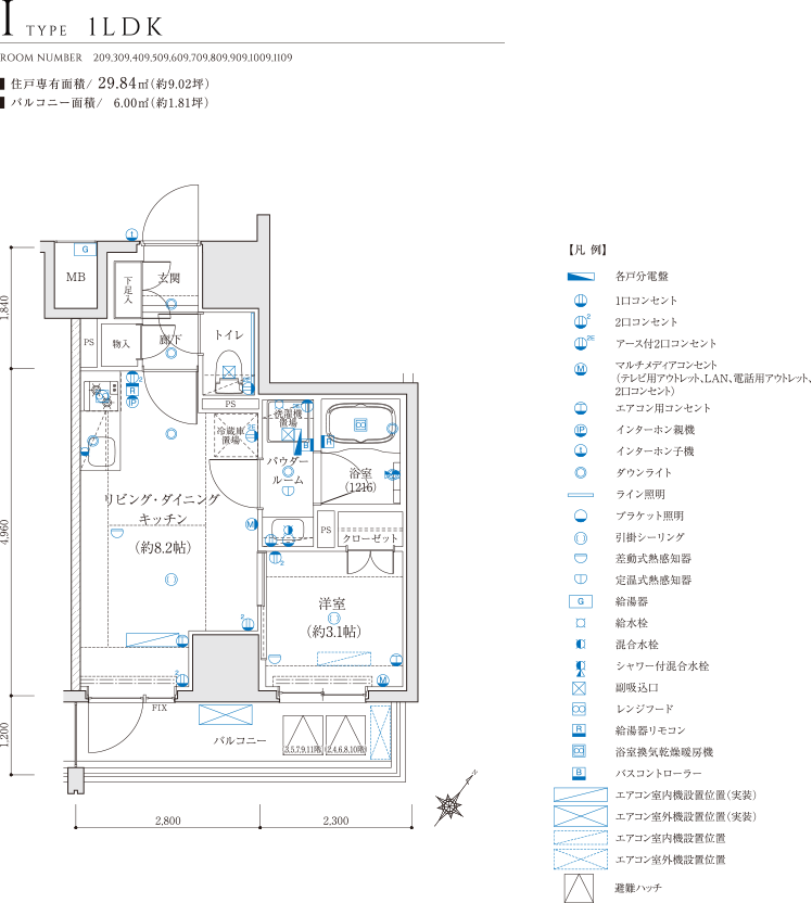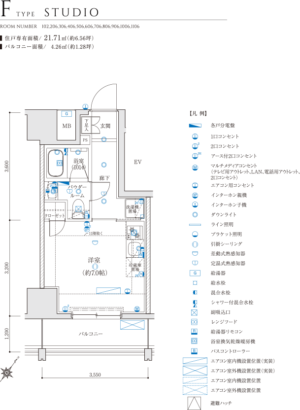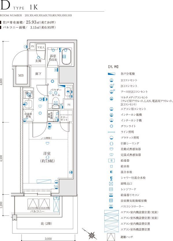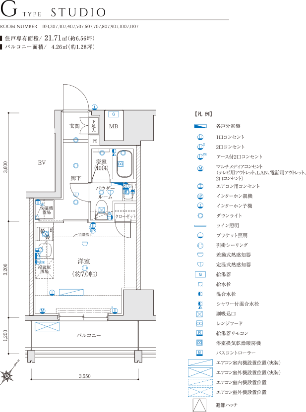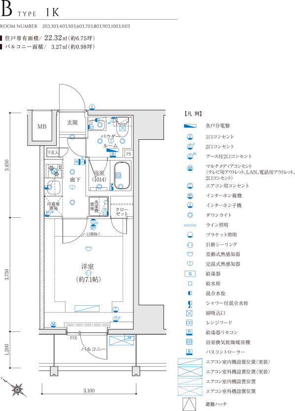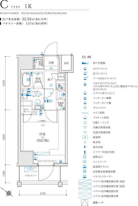- 専有面積にはMB(メーターボックス)、PS(パイプスペース)面積が含まれています。登記上の内法計算による面積は、専有面積より小さくなります。